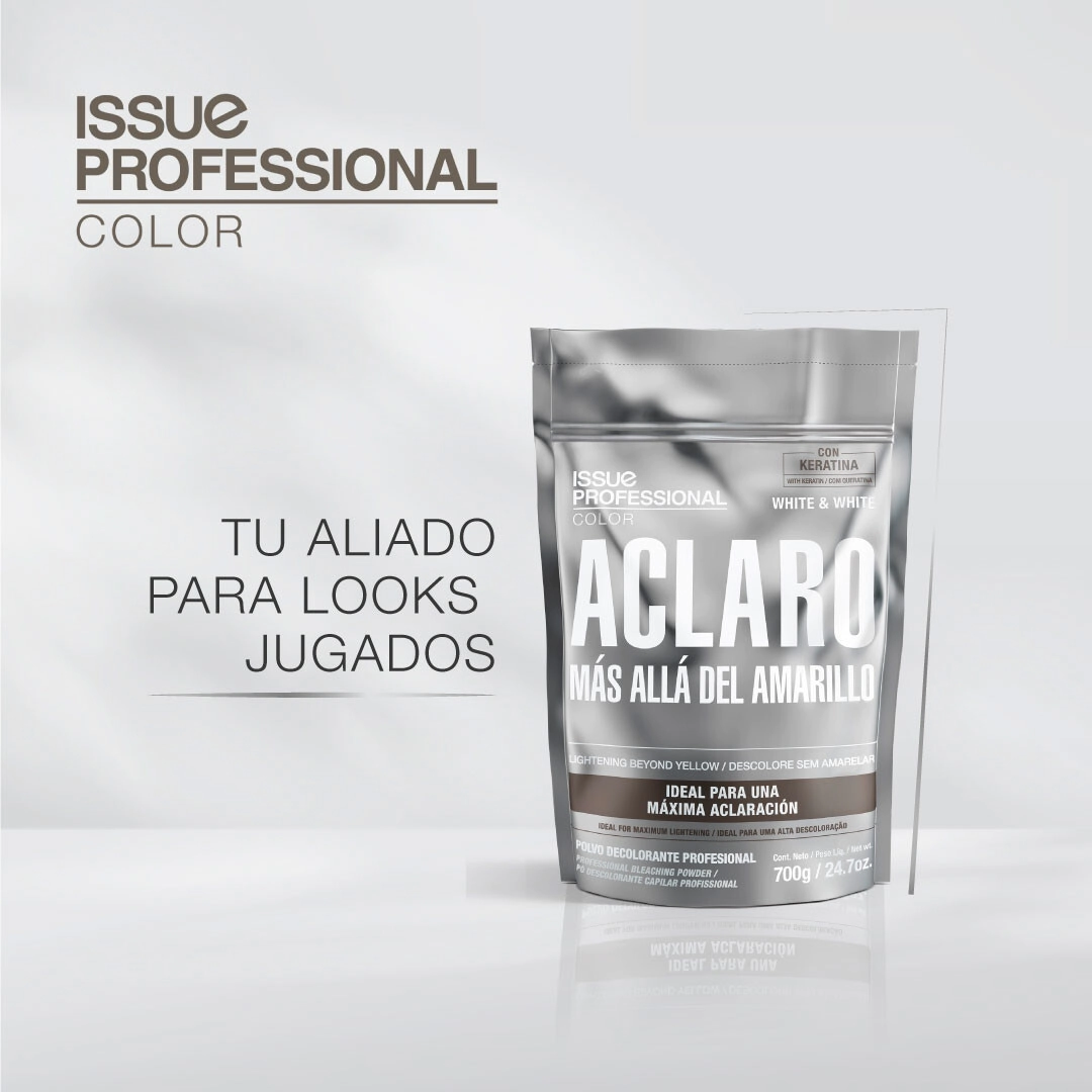 Mezclar una parte de Polvo Decolorante con 2 partes de Crema Oxidante Compatible Issue Professional en un recipiente plástico no metálico hasta conseguir una consistencia homogénea.